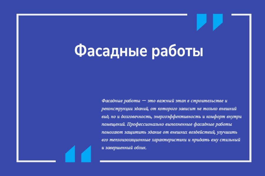 Фасадные работы — это важный этап в строительстве и реконструкции зданий, от которого зависит не только внешний вид, но и долговечность, энергоэффективность и комфорт внутри помещений. Профессионально выполненные фасадные работы помогают защитить здание от внешних воздействий, улучшить его теплоизоляционные характеристики и придать ему стильный и завершенный облик.